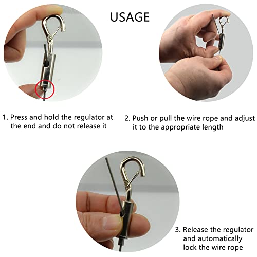 Lunghezza regolabile: la corda in acciaio può essere regolata a qualsiasi lunghezza entro 2 metri. Il processo di regolazione è semplice. Basta premere il regolatore sul retro del gancio e tirare le funi metalliche.