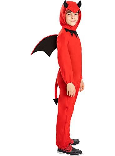 Include: Costume per bambini. Tuta con ali, cappuccio e coda. Color Rosso. Materiale 100 Poliestere. NON INCLUDE: Tridente