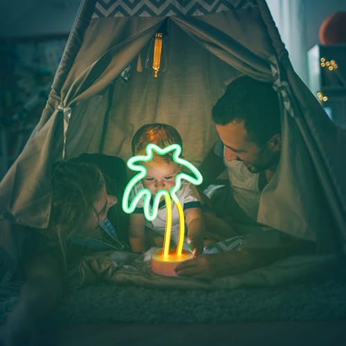 Funmo Luci al neon con palma, Luce al neon dell'albero di cocco con base, Batteria/USB alimentato Lampada Led Effetto Neon,Segnaletica al Neon per Camera da letto, Bar, Festa, Natale