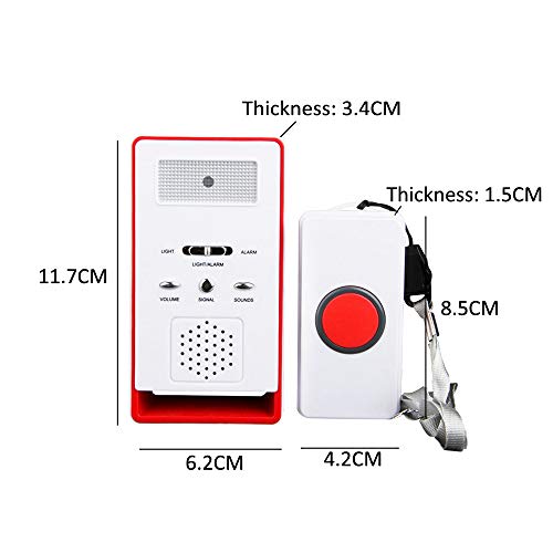 Altre opzioni di allarme: 45 suoni (36 suoni melodia e 9 suoni di allarme) tra cui scegliere, e tre modalità di allarme (suono+luce, solo suono, solo luce). Volume del suono regolabile a 5 livelli, max 110 db ideale per gli anziani. Nessun interruttore di alimentazione è progettato per evitare di dimenticare di accendere potrebbe perdere importanti chiamate di emergenza (se non si utilizza per lungo tempo, si prega di estrarre le batterie per proteggere la durata della batteria).