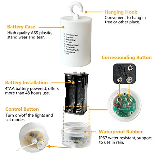 【Design impermeabile IP65】 La scatola della batteria e filo di rame luci sono entrambi impermeabile. Scatola batteria impermeabile IP65, LED SMD0603 IP67. Può funzionare bene anche in giorno piovoso, ma per favore evit diare impregnarsi in acqua per uso a lungo termine.