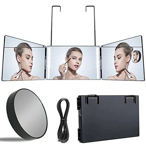 Furado Specchio a 360 Gradi,Specchio Per Trucco a Tre Ante Con Luci Led,Self Cut Mirror,Specchio a 3 Facce Con Ganci Telescopici Regolabili In Altezza,Specchio a Tre Vie Ideale Regali Donna Compleanno