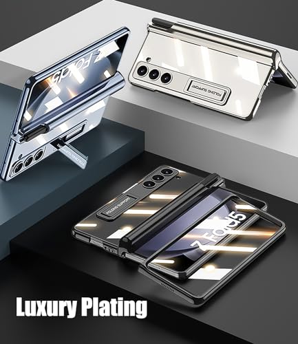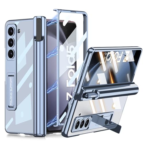 Furwabo Custodia Trasparente per Samsung Galaxy Z Fold 5 con Protezione Cerniera Magnetica e Porta Pen S, Cover Antiurto Placcata Chiaro con Cavalletto Regolabile e Proteggi Schermo per Z Fold 5 (Blu)