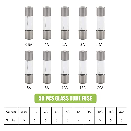 Set di Fusibili in Vetro,Fusibili Rapidi in Vetro,Fusibili Misti in Vetro,Assortimento Fusibili in Vetro ad Attacco Rapido,50 pezzi 20 mm x 5 mm 250V (0,5A,1A,2A,3A,4A,5A,8A,10A,15A,20A)