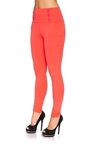 Futuro Fashion - Pantaloni Smart Donna con Tasche e Bottoni - Vita Alta - Cotone - Taglie dalla 40 alla 50-1071 - Corallo - 40 (S)