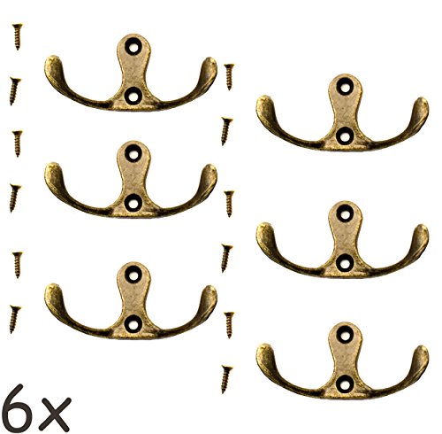 Fuxxer, set di 6 ganci doppi appendiabiti con effetto anticato, in ghisa di ferro, con effetto ottone o bronzo, in stile retrò, vintage e rustico, per giacche, asciugamani, vestiti