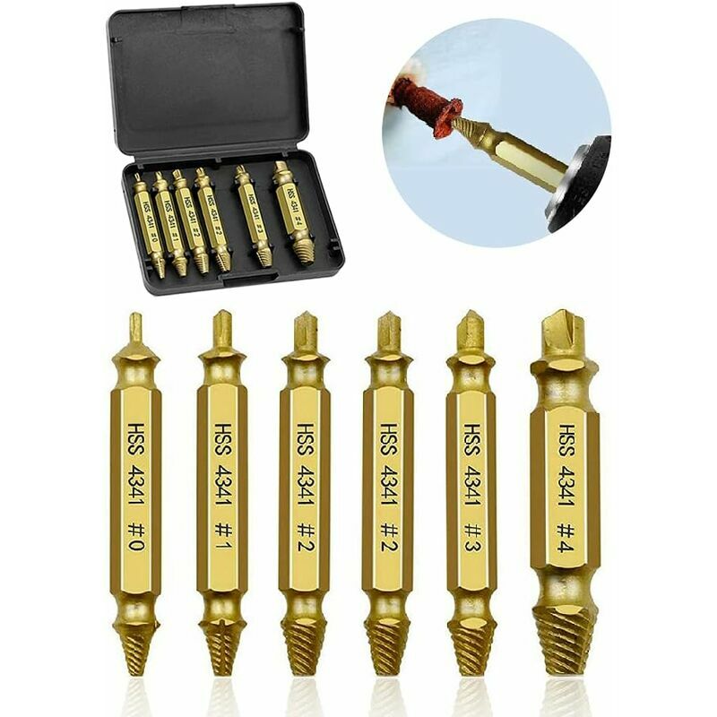Specifiche: Colore: oro. Materiale: acciaio rapido Hss. Quantità: 6 pezzi. Dimensioni: 1pc × 0# gamma disponibile di estrattori a vite: 2 - 3 mm;
