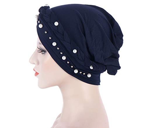 Fxhixiy Donne Hijab Perline Perla Treccia Turbante Cappello Testa Sciarpa Cancro Chemo Berretti Bandana Headwrap Cap, Blu navy, taglia unica