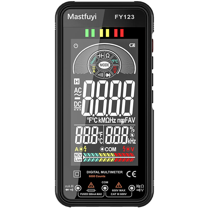Questo misuratore è un multimetro digitale portatile, con velocità di misurazione elevata, ampio display LCD e funzione torcia, è adatto per uso professionale, di fabbrica, scolastico, hobbistico o domestico. Caratteristiche: 1. Multimetro digitale: il multimetro digitale può misurare la tensione CA e CC, la corrente CA e CC, la resistenza, la capacità, la frequenza, la continuità, la temperatura ambiente, NCV, vero valore efficace, filo sotto tensione, diodo. 2. Schermo LCD: lo schermo LCD migliora notevolmente l'esperienza di lettura. La funzione di retroilluminazione lo rende molto facile da leggere anche in pieno sole o in condizioni di scarsa illuminazione. 3. Misurazione intelligente (AUTOMATICA): in modalità intelligente, può misurare automaticamente la tensione CA/CC, la resistenza, il cortocircuito e la frequenza. 4. Funzione torcia: il design della torcia ti consente di testare in modo efficiente e confortevole ovunque, all'interno e all'esterno, giorno e notte. 5. Comodo e
