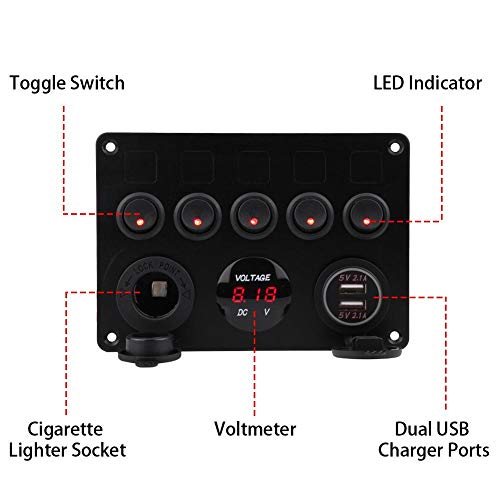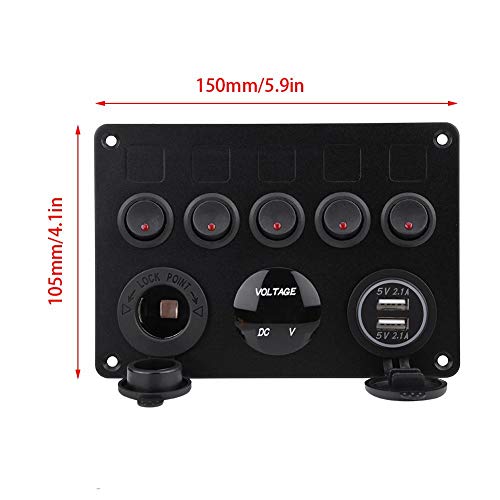 Fydun Toggle Switch Panel 12-24V 5 Gang On/Off Toggle Panel Doppio voltmetro USB per auto Marine Marine Truck(Rosso)