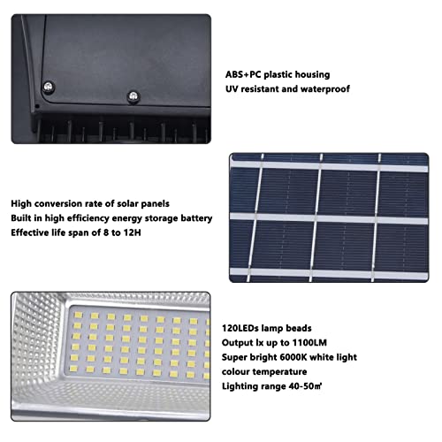 【Elevata luminosità】 Il lampione solare ha perline di lampada da 120 LED con un'uscita lx fino a 1100 LM, una temperatura di colore bianca super luminosa di 6000 K e una gamma di illuminazione di 40‑50 ㎡.