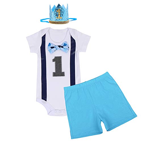 FYMNSI - Pagliaccetto a maniche corte per bambini, per il primo compleanno, in cotone, con pantaloncini, body e corona, per fotografie, costume per shooting fotografico, 3 pezzi, Blu, 12 mesi