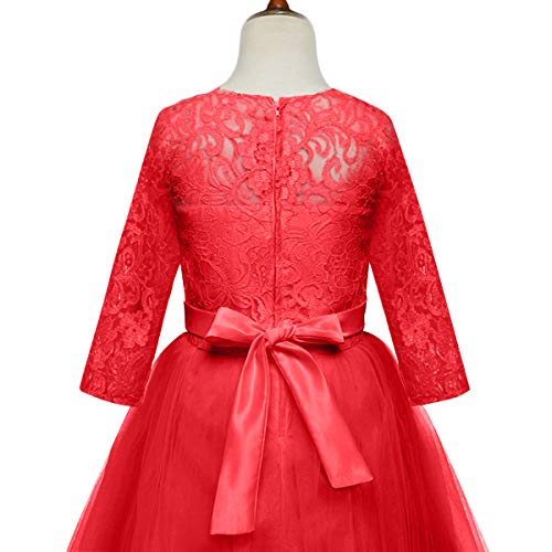 FYMNSI Ragazze Abiti da Sera Manicotto 3/4 di Pizzo Fiore Lungo Bambina Elegante Principessa Vestito Matrimonio Damigella d'Onore Festa di Compleanno Cerimonia Tutu Tulle Maxi Abito Rosso 5-6 Anni