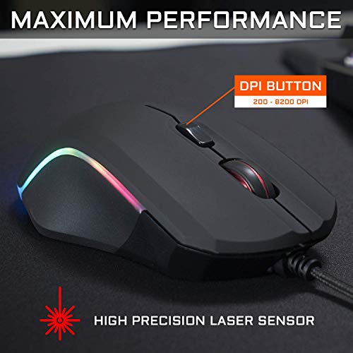 il mouse da gioco kult promethium ti da una massima precisione ed efficienza quando giochi il sensore laser pixart è l'avanguardia dell'innovazione e ti permette di regolare la sensibilità fino a 8200 dpi in 6 passaggi;