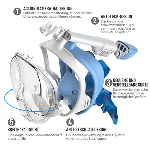USO CORRETTO - Le maschere per lo snorkeling integrale sono progettate per lo snorkeling in superficie per il tempo libero. Non è consigliabile effettuare immersioni in apnea seria perché non è possibile effettuare la compensazione. Segui anche la regola del compagno: non fare mai snorkeling da solo. Acquisisci familiarità con la tua attrezzatura prima di partire. Provalo in piscina e assicurati che si adatti e sigilli.