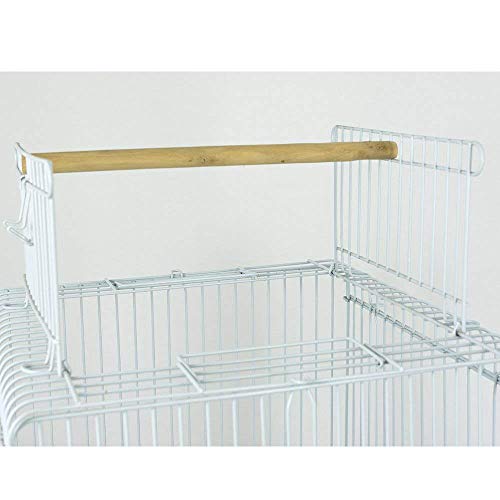 La parte superiore della gabbia può essere tenuta chiusa o aperta e fungere da trespolo inserendo nell'apertura l'apposito posatoio. Due maniglie laterali poste nella parte superiore, consentono un facile trasporto della gabbia.