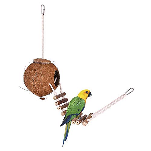 Gabbia per uccelli in cocco naturale con scala, altalena sospesa per arrampicata, amaca, scala girevole in legno per parrocchetti, conuri, are, uccelli innamorati, fringuelli, Mynah