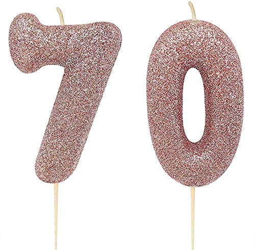 Gadget Giant Candela glitterata scintillante per torta di compleanno con numero 70 e 6 candeline metallizzate, oro rosa