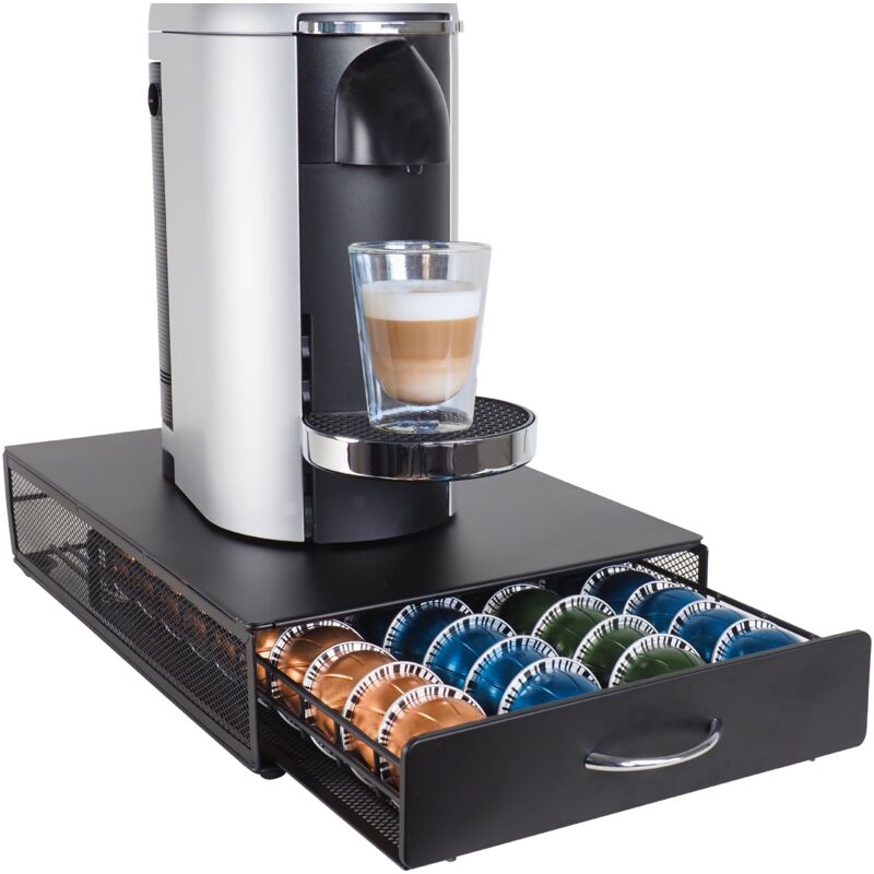 Con questo porta capsule Gadgy Nespresso Vertuo con cassetto è possibile conservare le capsule di caffè ordinate e finalmente liberarsi delle capsule di caffè che si trovano sul piano di lavoro. Questo porta capsule mantiene anche il peso del tuo dispositivo Vertuo, in modo da poterlo posizionare sul vassoio e non occupa spazio extra. Quando si conservano le capsule di caffè sotto la macchina Nespresso Vertuo, avrete sempre a portata di mano le vostre tazze preferite. Il cassetto si apre facilmente con il manico nella parte anteriore e ha un fermaporto, in modo da poter facilmente raggiungere le varianti posteriori. Il fondo del cassetto è dotato di uno strato di rete che mantiene le capsule in posizione e impedisce che cadano. Grazie ai piedini antiscivolo, non ci sono graffi sul piano di lavoro e il cassetto rimane stabile. Caratteristiche - Adatto per 40 capsule Vertuo - Piedini antiscivolo - Anti-vibrazione (riduce il rumore del dispositivo) - Ferro con verniciatura a polvere nera