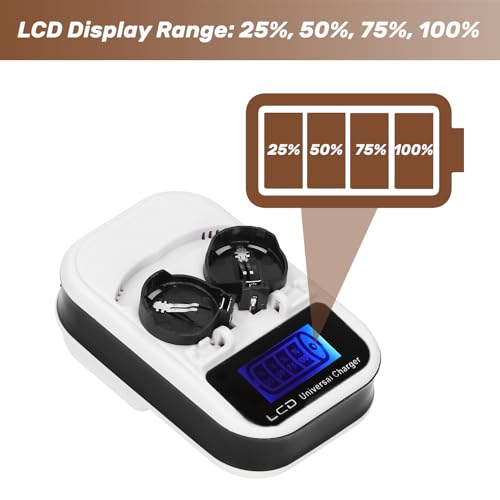CON INDICATORE DI CARICA: Questo caricabatterie a bottone con display LCD può mostrare il livello di carica della batteria come 25%, 50%, 75% o 100%, caricabatteria a celle a bottone, è molto chiaro vedere il cambiamento del valore