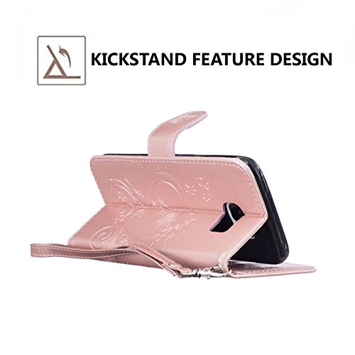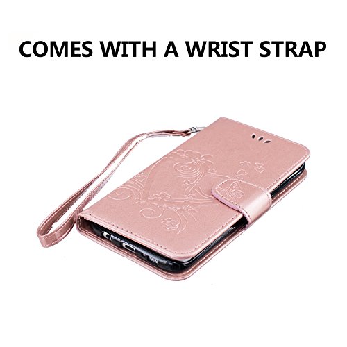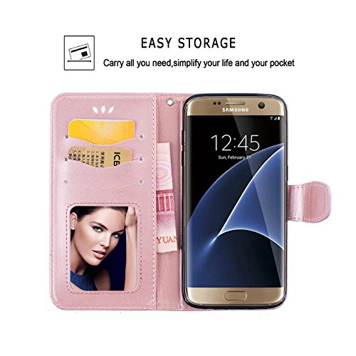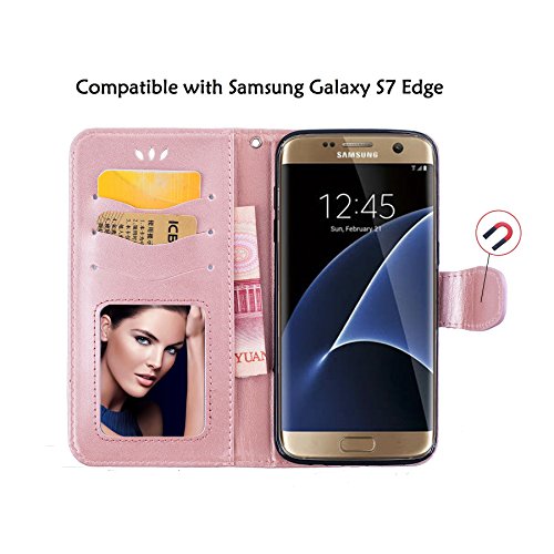 Galaxy S7 Edge Cover, CXTcase Samsung S7 Edge Custodia Pelle Portafoglio Magnetico Book Style Flip Case con Cinturino da Polso Cover per Samsung Galaxy S7 Edge Retro Fiore Farfalla Oro Rosato