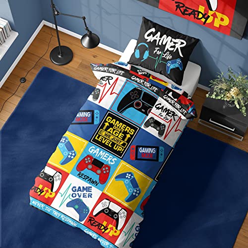 Gamer Set copripiumino per letto singolo, motivo: Gamers Respawn Level Up - Set di biancheria da letto reversibile - policotone