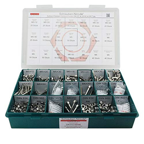 Gamma M5 + M6 DIN 912 A4 in acciaio inox (V4A) Viti (Allen) - Set composto da viti, rondelle (DIN 125, 127, 9021) e dadi (DIN 934, 985) - 650 pezzi