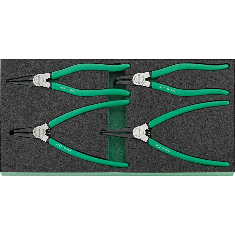 Modulo utensili pinze per anelli di sicurezza n. TCS 10 821/4 - Inserto in schiuma a 2 colori resistente alle sostanze chimiche. gli utensili mancanti vengono immediatamente identificati - Assortimento di utensili nell'inserto modulare Tool Control System (TCS) Contenuti: 1 Pinza per anelli di sicurezza per anelli interni. dritta. J 2 1 Pinza per anelli interni. angolata. J 21 1 Pinza per anelli esterni. dritta. A 2 1 Pinza per anelli esterni. angolata. A 21