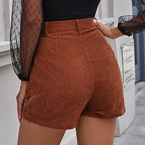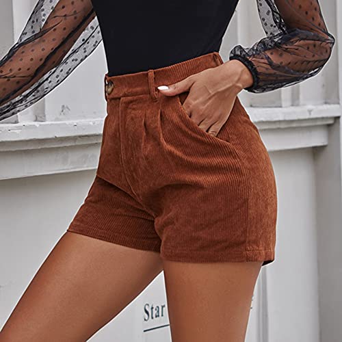 GANBADIE - Pantaloncini da donna, gamba dritta, in velluto, a costine, casual, vita alta con tasche marrone S