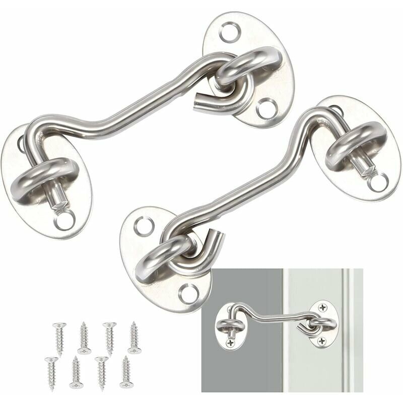 Robusto e durevole? Il gancio antivento in acciaio inossidabile di alta qualità assicura che non arrugginisca e abbia una lunga durata. Diametro del corpo principale del gancio della cabina: 0,6 cm, lunghezza: 10 cm. ?Funzione? Il gancio per cabina è ideale per fissare la posizione di porte, cancelli e finestre. Il gancio Storm è antivento ed è ideale per comandare l'apertura di finestre o porte e per sostegni silenziosi. ?Facile da installare? Il gancio antivento è facile da installare. Ogni chiusura viene fornita con viti in 4 parti. Il gancio per cabina in acciaio inossidabile è costituito da un gancio e un occhiello di facile utilizzo e ti aiuta a fissare saldamente la serratura della porta del fienile. ?Perfect Life Design? Il gancio per cabina si adatta allo stile mutevole degli interni, qualunque stile possa essere integrato. Il gancio antivento con occhiello può essere utilizzato per qualsiasi interno, ad esempio B. per garage, ripostiglio, armadietti della cucina, bagno