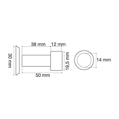 Dimensioni: Diametro Ø: 14 / 19,5 mm / Lunghezza: 50 mm / Lunghezza totale: 53 mm / Piastra: Ø 30 x 3,6 mm (svasata Ø 14,2 x 1 mm)