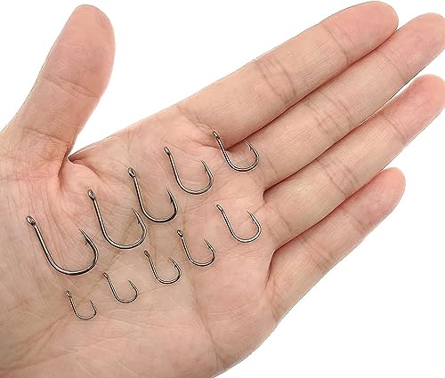 JZK 100 ganci assortiti misura 3 4 5 6 7 8 9 10 11 12, ami da pesca in acciaio al carbonio con occhi, piccoli ami da pesca con barba, ami da pesca a cerchio con scatola di plastica