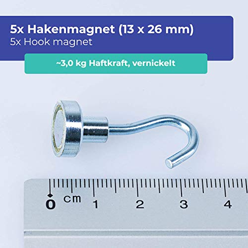 5 x Ganci magnetici al Neodimio | Diametro Ø 13 mm, lunghezza 26 mm | Zincato (NiCuNiZn) | Forza di attrazione circa: ~ 3 kg | 5 pz. Calamita con gancio neodimio