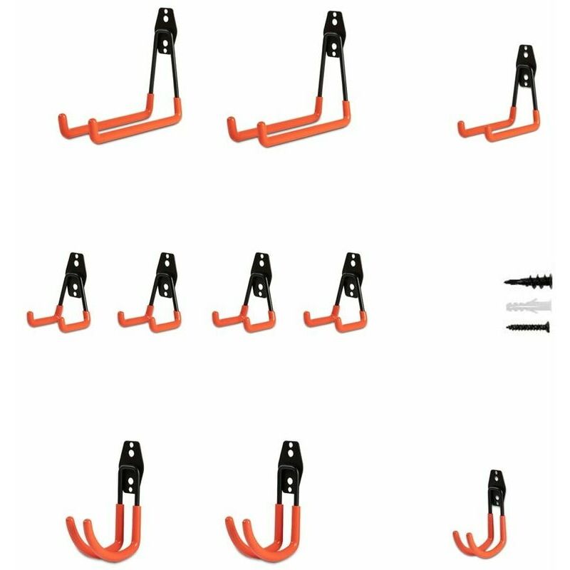 Ganci da parete per garage - x10 Ganci da parete multiuso per carichi pesanti. Fissa questi ganci alla parete del tuo garage o casetta da giardino per organizzare e riporre tutta la tua attrezzatura: attrezzi da giardinaggio, scaletta, biciclette, prolunga, tubi da giardino... I ganci da garage sono rivestiti con gomma antiscivolo che protegge i tuoi oggetti. La loro installazione è semplice e veloce grazie alle viti in dotazione. Informazioni tecniche Materiale: struttura gancio: acciaio protezione: PVC Dimensioni dei ganci in base alla loro forma: piccolo J: H. 4 cm x L. 6,5 cm grande J: H. 4 cm x L. 11 cm piccolo L: H. 6,5 cm x L. 7 cm medio L: H. 6,5 cm x L. 13 cm grande L: H. 6,5 cm x L. 19 cm piastra di montaggio (comune a tutti i ganci): H. 6,5 cm x L. 3,7 cm x Spessore . 0,02 cm Peso totale: 1,5 kg Colori: nero e arancio Composizione del set ganci: 10 ganci a muro + fissaggi a muro inclusi 1 piccolo J 2 grande J 4 piccolo L 1 medio L 2 grande L 22 tasselli 21 viti 20 viti in
