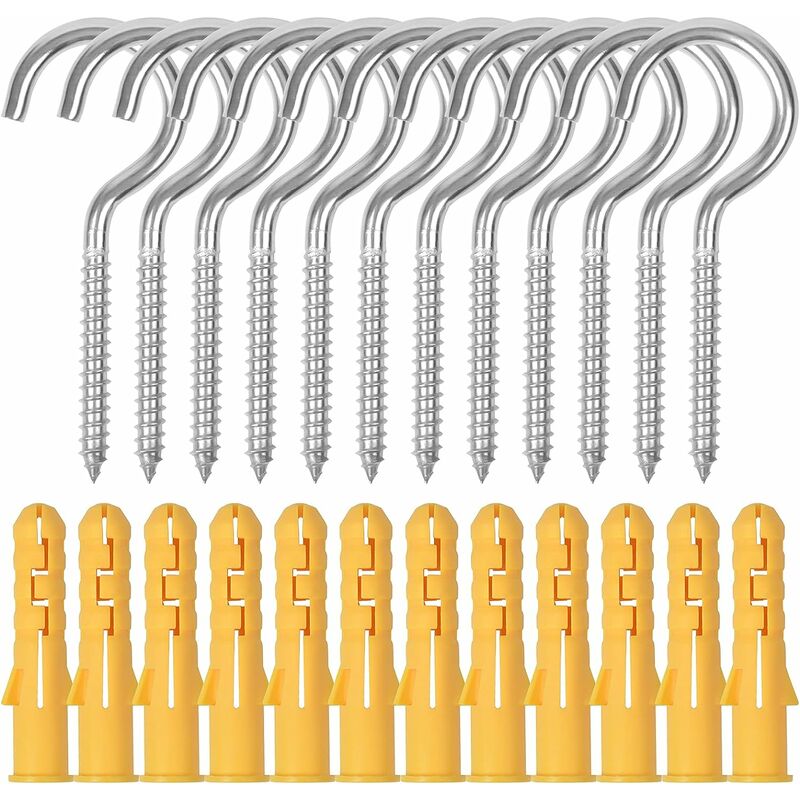 Materiale durevole: i ganci a vite sono realizzati in acciaio inossidabile, antiruggine, resistente all'acqua, superficie liscia che non danneggerà le mani Misura perfetta: la dimensione della vite autofilettante è: M6 x 90, lunghezza totale: 90 mm, diametro interno dell'anello: 25 mm. Lunghezza maggiore per una maggiore sicurezza Facile da installare: l'estremità a vite in acciaio può essere facilmente montata nel legno, il triangolo non isoscele con filettatura speciale, affilato e facile da avvitare nel legno o nel muro.< /p> 【Ampia applicazione】 Perfetto per armadio, armadietto, legno, parete, soffitto per appendere piante, cesti, piante, luci, tende, corde, tazze, grembiuli ecc. Ideale per esterni e interni Il kit di ganci comprende: i ganci in acciaio inox sono dotati di 12 tubi di prolunga in plastica, 12 ganci, che possono essere utilizzati con i ganci per ottenere un buon effetto di fissaggio.