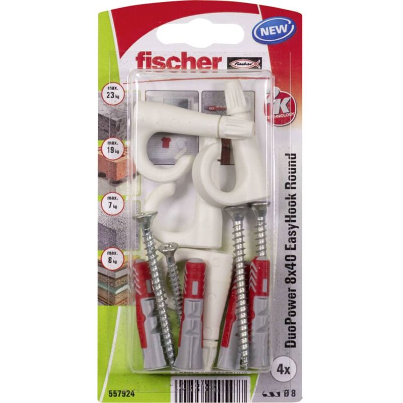 Dettagli tecnici Materiale Plastica rinforzata con fibra di vetro Ulteriori dati tecnici Diametro della punta 8 mmProfondità min. del foro 50 mmSpessore min. piastra 12,5 mmMin. Profondità di avvitamento 46 mmAzionamento PZ2 Ø vite 6 mm Diametro della punta: 8 mmProfondità min. del foro: 50 mmSpessore min. piastra: 12,5 mmMin. Profondità di avvitamento 46 mmAzionamento PZ2 EasyHook EasyHook Avvitare la vite fino al gancio L'innovativa gamma di ganci trasforma le viti in ganci rotondi, ad occhiello o ad angolo. L'adattatore a gancio viene inserito sulla vite a testa svasata e montato a parete in modo rapido e sicuro con DuoPower o senza tasselli per l'impiego in legno. Grazie alla plastica rinforzata in fibra di vetro, i ganci possono sopportare carichi elevati e garantiscono una tenuta sicura. Grazie al punto di rottura, il gancio viene posizionato in modo ottimale e può essere montato con distanze di parete variabili. Un cappuccio di copertura aggiuntivo e un anello di copertura