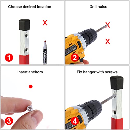 Facile da installare: è necessario un trapano elettrico e forse un livello per assicurarsi che sia allineato in fila per il montaggio sui perni sulla parete. Fare un segno in base alla distanza tra i due fori sul gancio, quindi praticare fori sul segno e inserire l'espansione di plastica, e infine fissare il gancio con la vite di metallo. Ogni gancio può sostenere in modo sicuro quando installato correttamente.