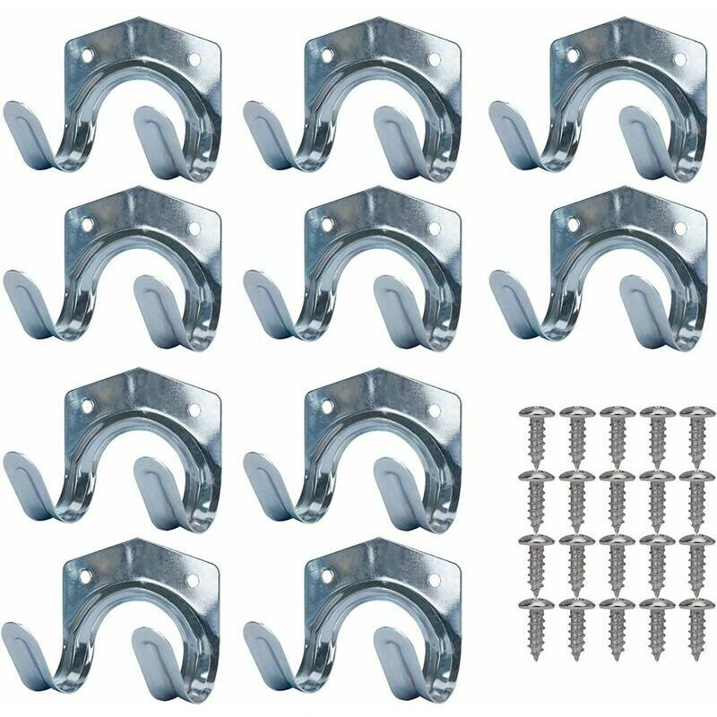 Durevole e non corrosivo - I ganci per attrezzi sono realizzati in acciaio resistente con resistenza e assenza di corrosione, la superficie dei ganci appesi ha un rivestimento liscio che previene a lungo la ruggine anche in caso di pioggia. 【Strumenti per appendere versatili】 I doppi ganci a forma di U sono perfetti per appendere pale, attrezzi da giardino, scope, scale, tosaerba, tubi, scope, martelli e altri utensili manuali. 【Dimensioni gancio】 Ciascuno il gancio del garage misura circa 7 cm x 6 cm / 2,7 pollici x 2,36 pollici (lunghezza x larghezza). La confezione include 10 ganci per portautensili e 20 viti extra. 【Facile da avvitare】 Questi doppi ganci antiscivolo a parete hanno fori preforati che consentono una facile installazione sulle pareti di capannoni, garage, cartongesso e officine. 【Applicazioni multiple】I grandi ganci per appendere sono adatti per garage, giardini, cantine, balconi, capannoni, cucine, balconi, fattorie, palestre, servizi igienici, magazzini, officine