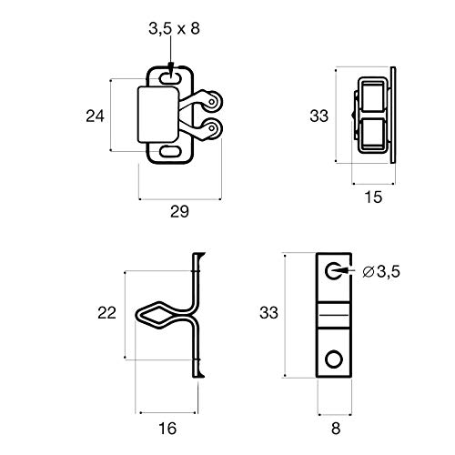 GANCIO: L x A x P: 29 x 33 x 15 mm / diametro sfere: 8 mm / distanza fori: 24 mm / dimensioni fori (foro asolato): 3,5 x 8 mm || CONTROPIASTRA: L x A x P: 8 x 33 x 16 mm / distanza fori: 22 mm / diametro fori: 3,5 mm