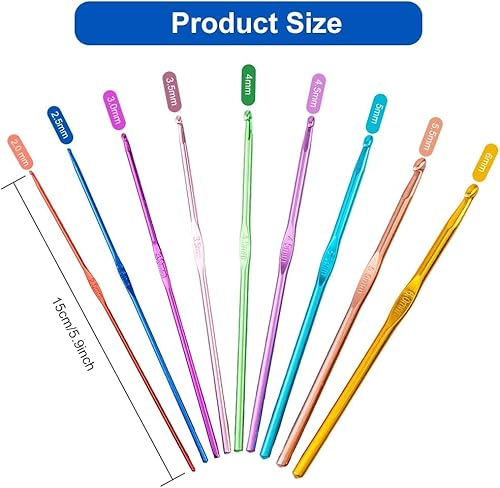 【Contenuto della confezione】Riceverete 9 ganci per uncinetto di diverse dimensioni. Gamma di dimensioni: 2.0mm, 2.5mm, 3.0mm, 3.5mm, 4mm, 4.5mm, 5mm, 5.5mm, 6mm. 15cm di lunghezza. Ogni manico è contrassegnato con la dimensione per una facile identificazione.