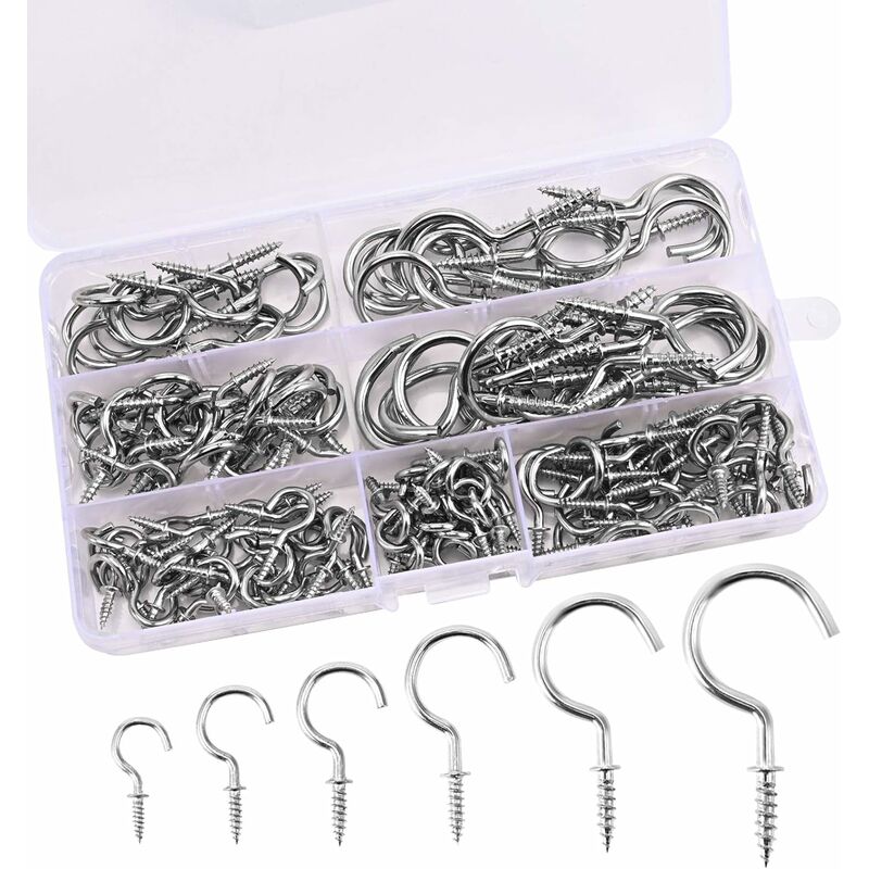 Il kit di ganci a vite è adatto per un ampio uso interno ed esterno. Con i nostri ganci a vite, puoi facilmente appendere oggetti a soffitti o pareti diversi all'interno o all'esterno della casa. Possono essere usati per appendere piante verdi, tazze da caffè, bottoni o cappelli, borse e altri oggetti, puoi anche appendere fili luminosi, mangiatoie, piccole gabbie per uccelli, ecc. Risparmia spazio in casa e così puoi usare il tuo genio per decorare la tua creatività. Quantità: 150 pezzi - Colore: Argento zincato - Materiale: Acciaio al carbonio resistente Rivestimento: La superficie è ramata e liscia senza spine. Nota: Questi ganci contengono punte di metallo, si prega di tenerli lontano dalla portata dei bambini. Ganci in metallo di qualità premium. 30 ganci da soffitto da 1/2". 30 ganci da soffitto da 5/8". Ganci da soffitto 30 x 1,9. 20 ganci da soffitto da 7/8". 12 ganci da soffitto da 2,5". 12 ganci da soffitto da 1-1/4". Ganci da soffitto 16 x 1-1/2". In quali scene possono