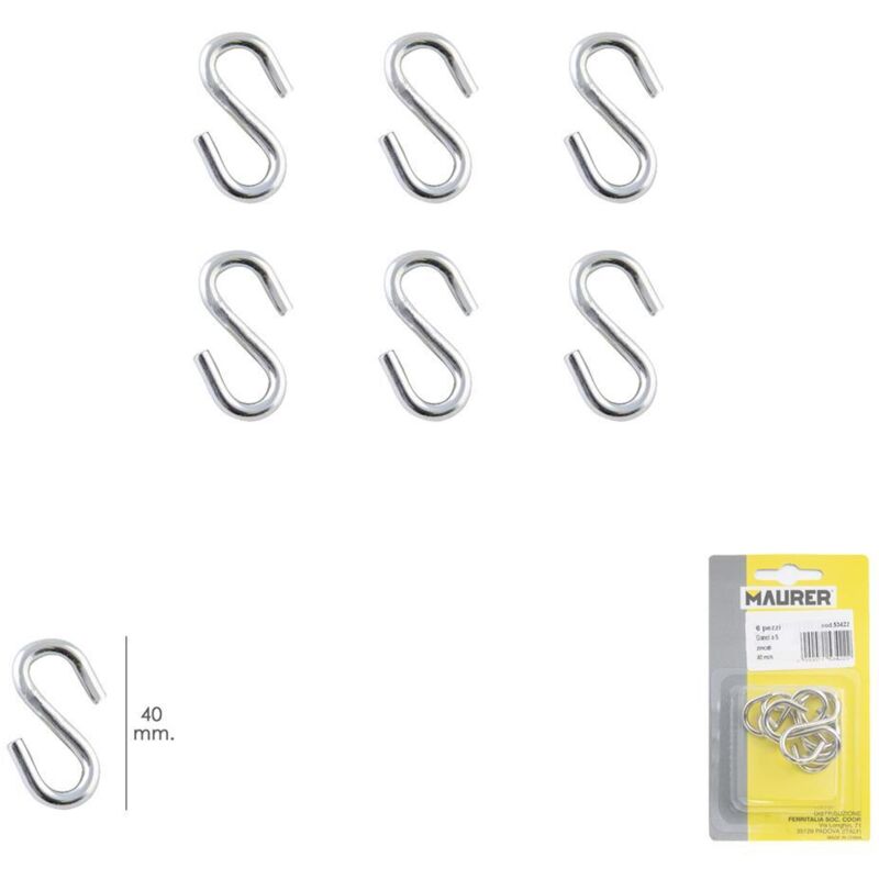 Gancio a forma di S - Misura: 40 mm. - Zincato, conferisce maggiore durezza e protezione contro la ruggine. - Il suo utilizzo non è appropriato per attività professionali o industriali o per fissare qualsiasi carico - Blister da 6 pezzi - Articolo noto come gancio a S, gancio a forma di S.