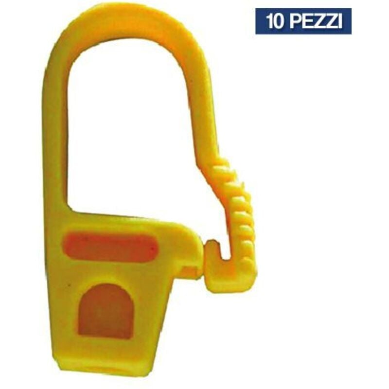 GANCIO PER CORDA ELASTICA Per corda: ø mm 8 Ideali per tensionamento di corde e funi elastiche ad uso interno ed esterno In ogni confezione sono presenti 10 ganci. Colore: Giallo.