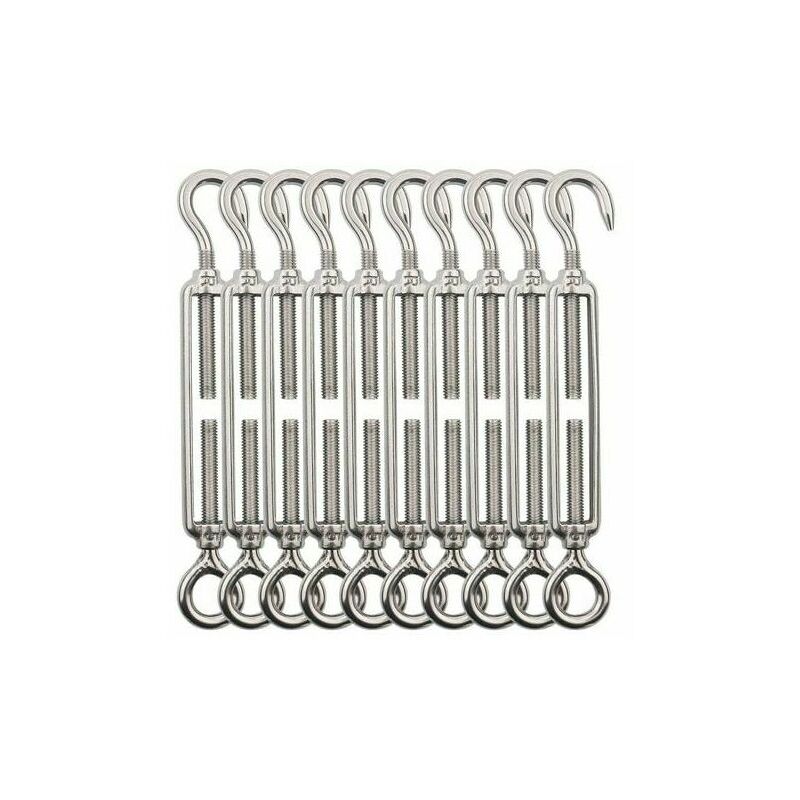 Dimensioni dei ganci del tenditore: M5, 10 ganci e occhiello del tenditore per tendere il cavo e la fune metallica. Tenditore M5 in acciaio inossidabile 304, materiale di alta qualità per una lunga durata. Il kit è facile da installare e fornisce un supporto sufficiente per collegare il cavo;