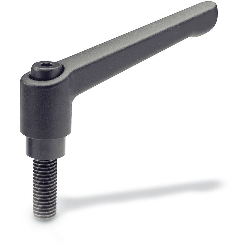 Manico lunghezza l1: 92 mm, altezza D1 filettatura: M10 L2, lunghezza filettatura: 40 mm, h: 64 mm Con vite filettata Manico corpo: zinco pressofuso, rivestimento in plastica: Nero, RAL 9005 strukturmatt Vite inserto e tieni vite: acciaio brunito Conforme a RoHS