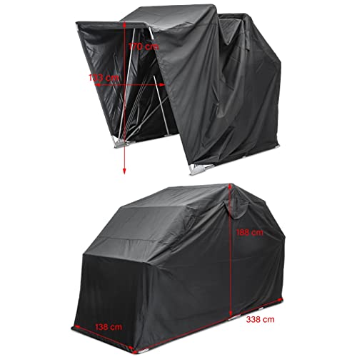 Dimensioni del garage per moto: lunghezza 338cm, larghezza 138cm, altezza 188cm. Adatto a moto più grandi come moto avventura, touring, sport touring, motos custom, maxi scooter ecc.