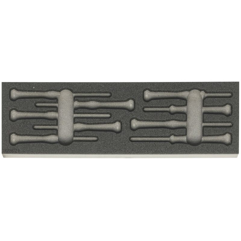 Assortimenti standard di utensili in alloggiamenti sagomati in espanso rigido bicolore in PE. La struttura non porosa dell'espanso è impermeabile e resistente agli oli. Strato superiore color antracite, quello inferiore di contrasto color grigio mette in evidenza gli utensili mancanti. Dati tecnici Tipo di prodotto Inserto in espanso rigido Forma in espanso rigido LD45, spessore, mm 30 Larghezza, mm 383 Numero di utensili 9 Shadow Board, mm 115 Profondità, mm 115 Esecuzione vuoto per assortimenti di utensili