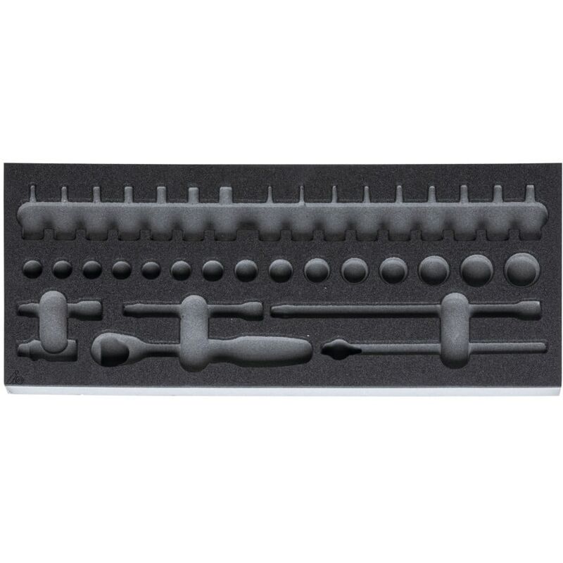 Assortimenti standard di utensili in alloggiamenti sagomati in espanso rigido bicolore in PE. La struttura non porosa dell'espanso è impermeabile e resistente agli oli. Strato superiore color antracite, quello inferiore di contrasto color grigio mette in evidenza gli utensili mancanti. Dati tecnici Tipo di prodotto Inserto in espanso rigido Larghezza in G 8 Profondità in G 20 Riempimento di un cassetto in G 8×20 Forma in espanso rigido LD45, spessore, mm 30 Larghezza, mm 200 Numero degli utensili 37 Profondità, mm 500 Esecuzione vuoto per assortimenti di utensili