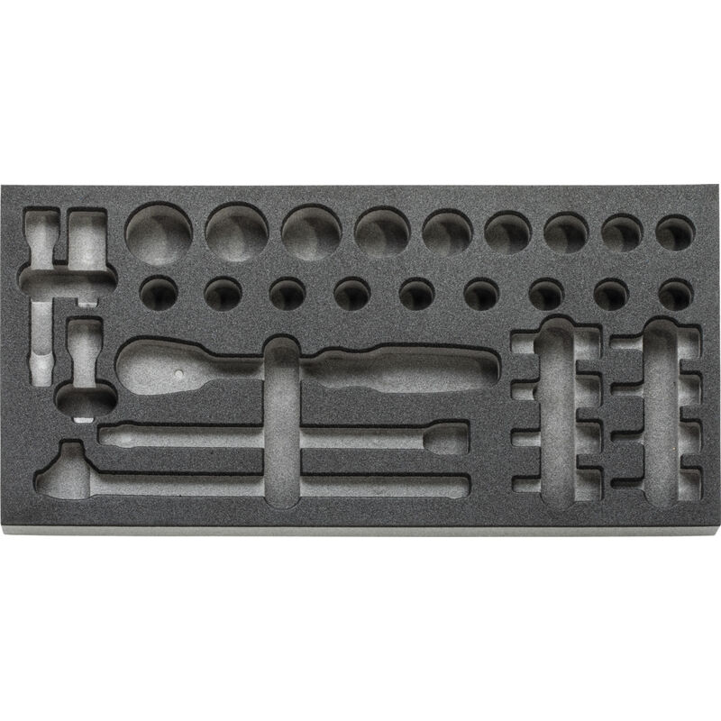 Assortimenti standard di utensili in alloggiamenti sagomati in espanso rigido bicolore in PE. La struttura non porosa dell'espanso è impermeabile e resistente agli oli. Strato superiore color antracite, quello inferiore di contrasto color grigio mette in evidenza gli utensili mancanti. Dati tecnici Tipo di prodotto Inserto in espanso rigido Larghezza in G 10 Profondità in G 20 Riempimento di un cassetto in G 10×20 Forma in espanso rigido LD45, spessore, mm 30 Larghezza, mm 200 Numero degli utensili 32 Profondità, mm 500 Esecuzione vuoto per assortimenti di utensili