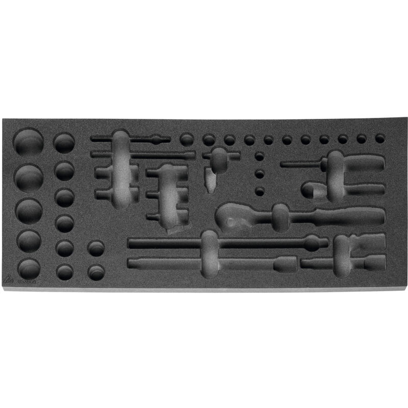 Assortimenti standard di utensili in alloggiamenti sagomati in espanso rigido bicolore in PE. La struttura non porosa dell'espanso è impermeabile e resistente agli oli. Strato superiore color antracite, quello inferiore di contrasto color grigio mette in evidenza gli utensili mancanti. Dati tecnici Tipo di prodotto Inserto in espanso rigido Larghezza in G 10 Profondità in G 24 Riempimento di un cassetto in G 10×24 Forma in espanso rigido LD45, spessore, mm 30 Larghezza, mm 250 Numero degli utensili 41 Profondità, mm 600 Esecuzione vuoto per assortimenti di utensili